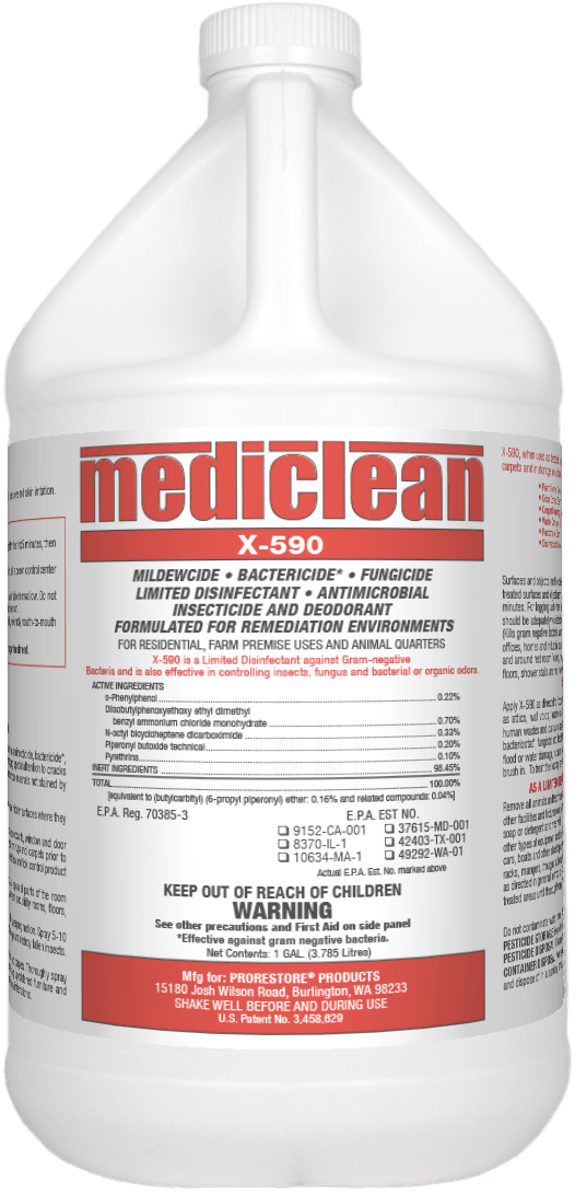 Just one application of the new Mediclean X-590 kills nuisance insects, mold, mildew and bacteria odors. It's registered for use on soft surfaces, including mattresses, so it's perfect for combating bed bugs. X-590 is also suitable for many decontamination applications including sewage backups, removal of carcasses and more.