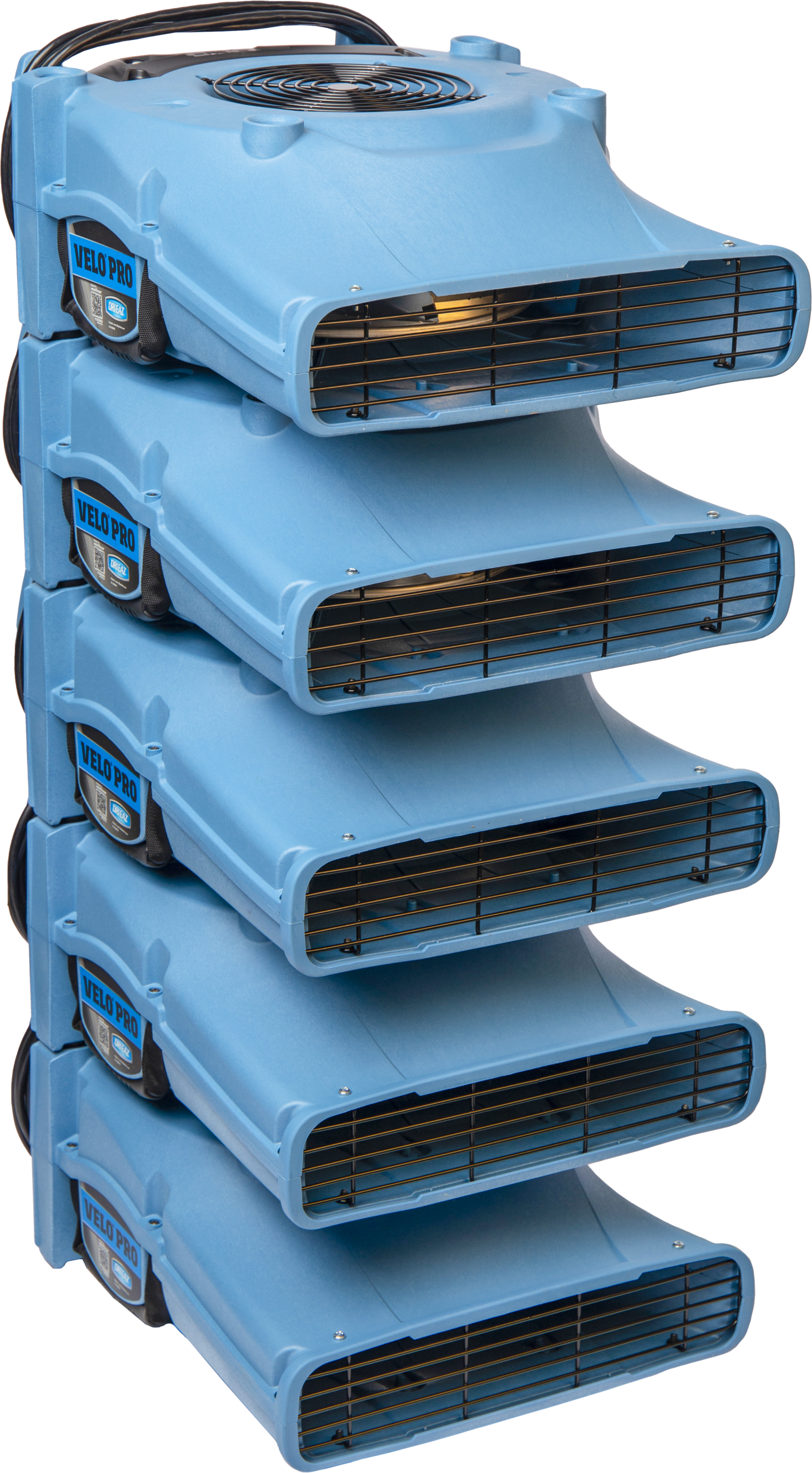 Boost your drying power with the Velo Pro! Using the same streamlined, highly portable housing as the base Velo unit, we’ve added valuable restoration-ready features to make floor, wall and stairway drying faster and easier. Use the variable speed control and digital amp readout to fine tune each unit in one-tenth amp increments. Combine this with the daisy-chain feature and you can get up to 10 Velo Pros on a single 15-amp circuit! A hour meter lets you track usage and maintenance intervals, and Pro model also includes a kickstand for convenient stair and wall drying.