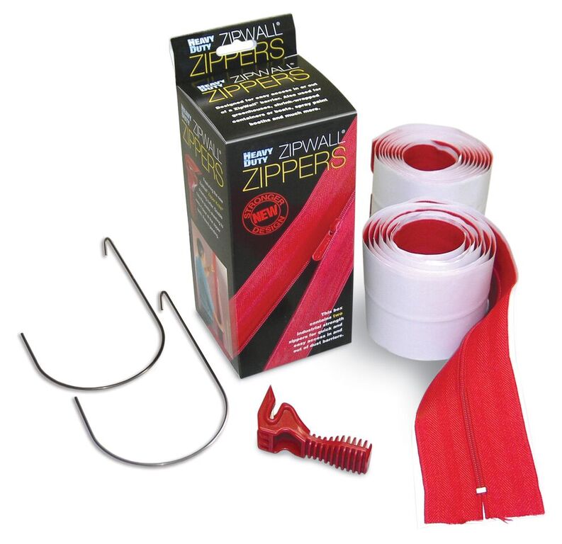 Durable self-adhesive zippers attach to plastic sheeting and create an entry in seconds. Two zippers can create a hands-free door. The 7 foot long 3 inch wide heavy-duty zipper withstands high traffic. Specially designed ZipperKnife™ double-cuts the plastic to prevent jams. Flap hooks hold the entryway open for easy access.